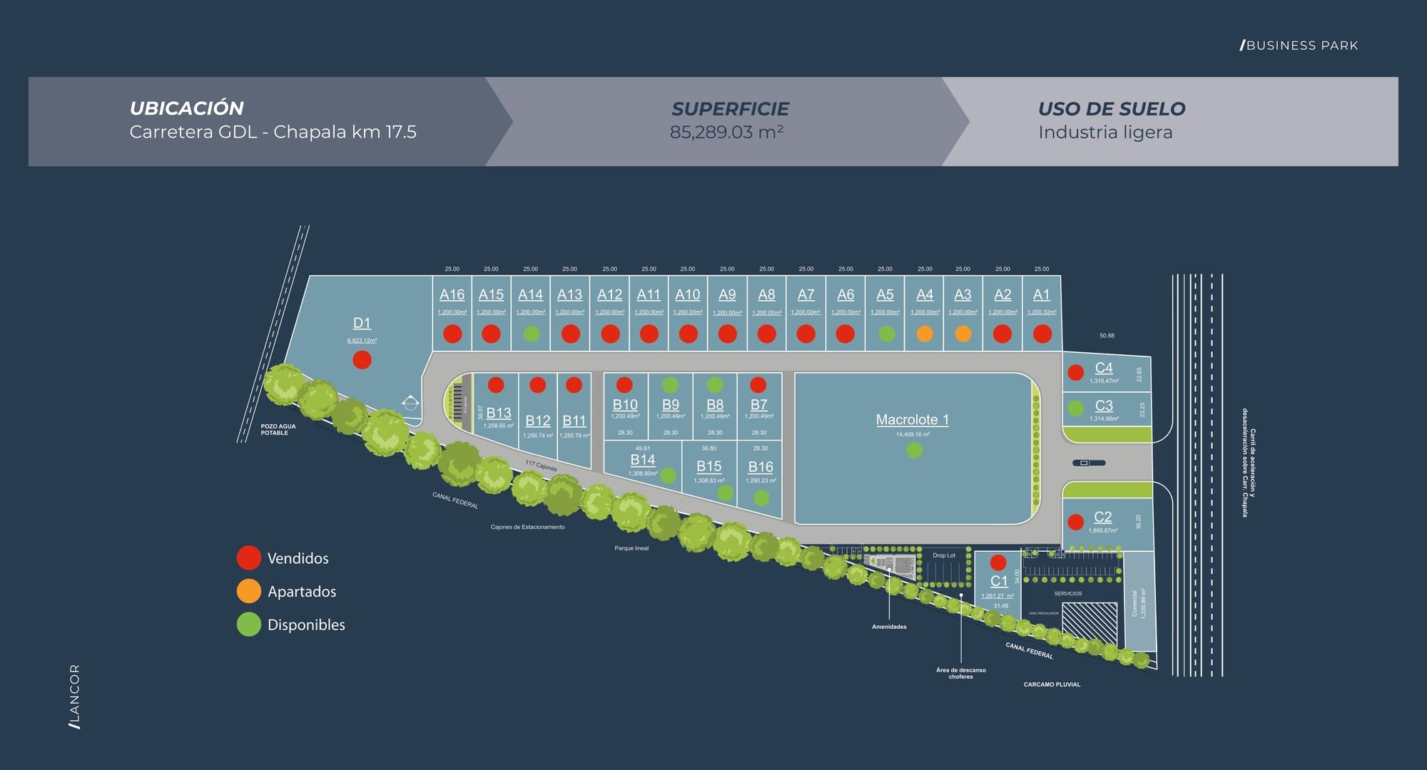 LANCOR BUSINESS PARK es un desarrollo industrial a pie de Carretera GDL – Chapala con una ubicación privilegiada por estar en el corazón del corredor industrial de la ciudad y tener accesibilidad a múltiples salidas que conectan con los estados más importantes del país, además de su gran cercanía con el Aeropuerto Internacional de Guadalajara que es el principal aeropuerto de carga del país y el segundo más importante en turismo.